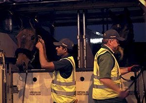 Once pre-flight checks and preparation are complete, the horses are unloaded from the truck and walked  into the jet-stall. The stall is is then towed and loaded onto the aircraft and the horses are settled in preparation for take-off.