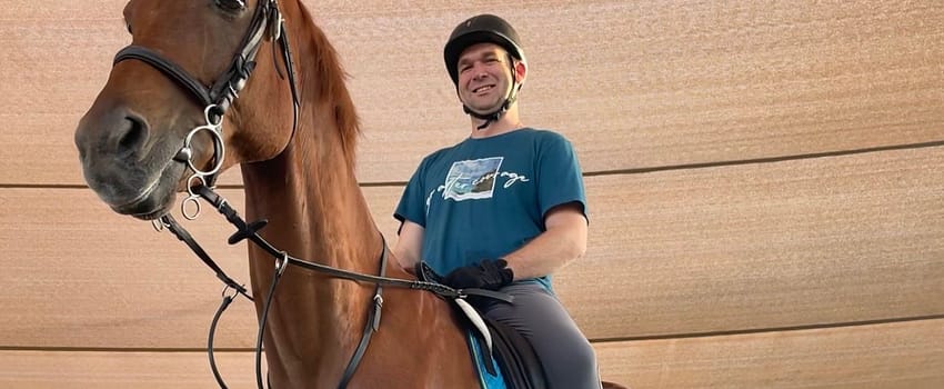 Of his horse riding experience, Stroud says, “I am what many might call “a happy hacker”. I will never profess to be the best rider and have many bad habits that I am working on eliminating. I am however finding that as I improve, I increase the list of corrections I realise there is still to work on. I love riding and am particularly enjoying the process of working with and learning together with the beautiful chestnut boy that I lease.”